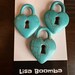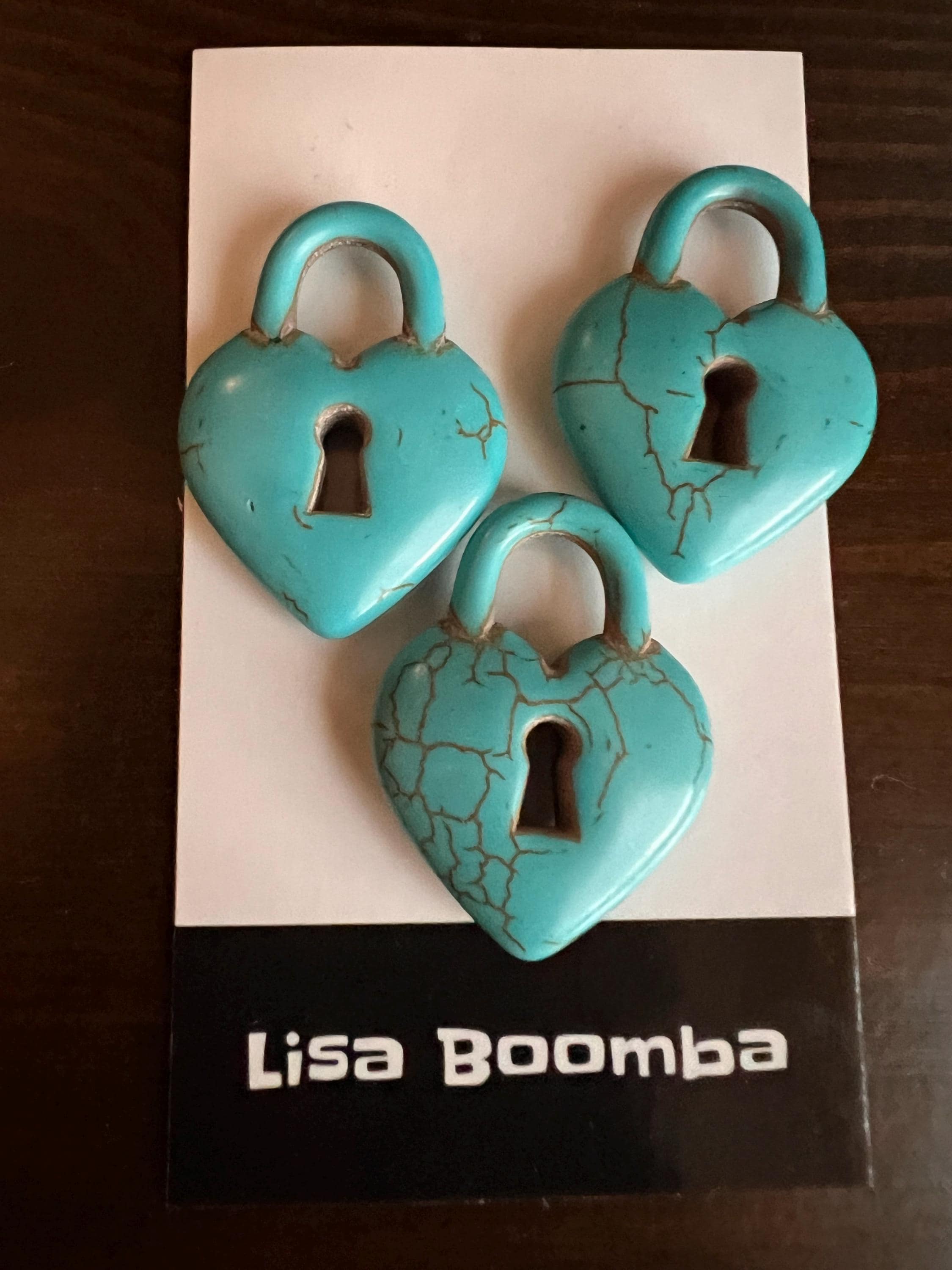 Blue heart-shaped padlock. The hearts measure about 25mm by 25mm by 7mm. The length from the bottom of the heart to the top of the loop is around 33mm. The inside of the loop measures about 8mm. The key hole is also open. The large hole allows many design options. Add jump rings to attach chain or to make into a pendant. Use ribbon, leather, cord or chain to thread directly through the hole. Add to a bracelet. Add to a jewelry box or other craft project as a decorative lock. Please ask if you need a different quantity. Synthetic turquoise.